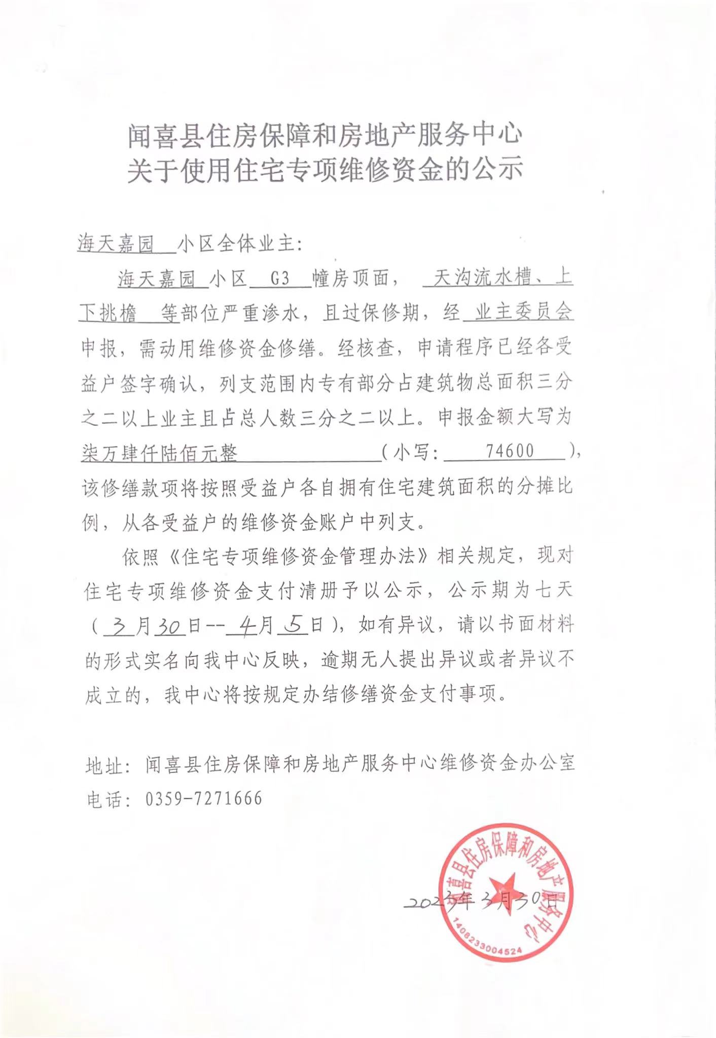 关于海天嘉园小区G3楼使用住宅专项维修资金的公示