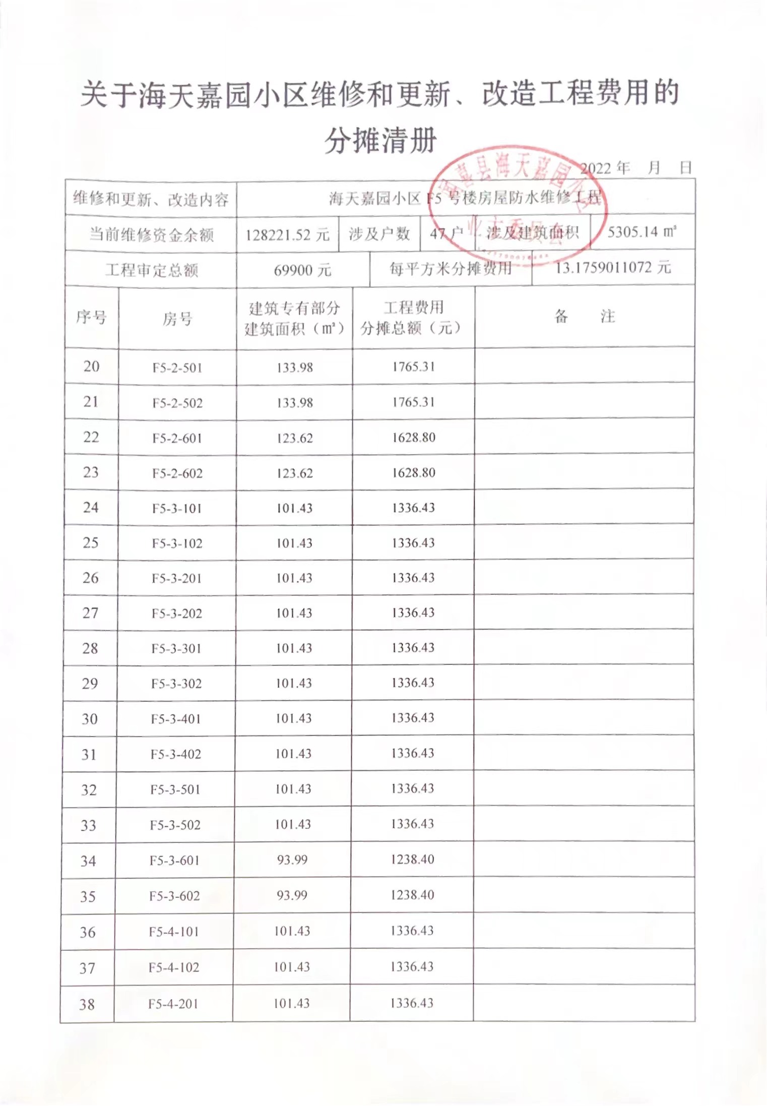 关于海天嘉园小区F5号楼使用住宅专项维修资金的公示